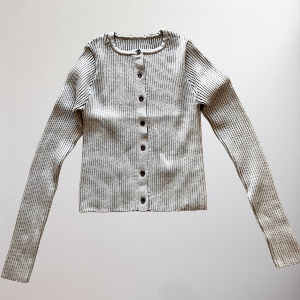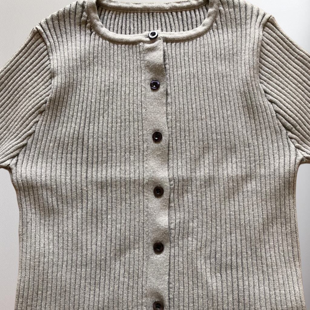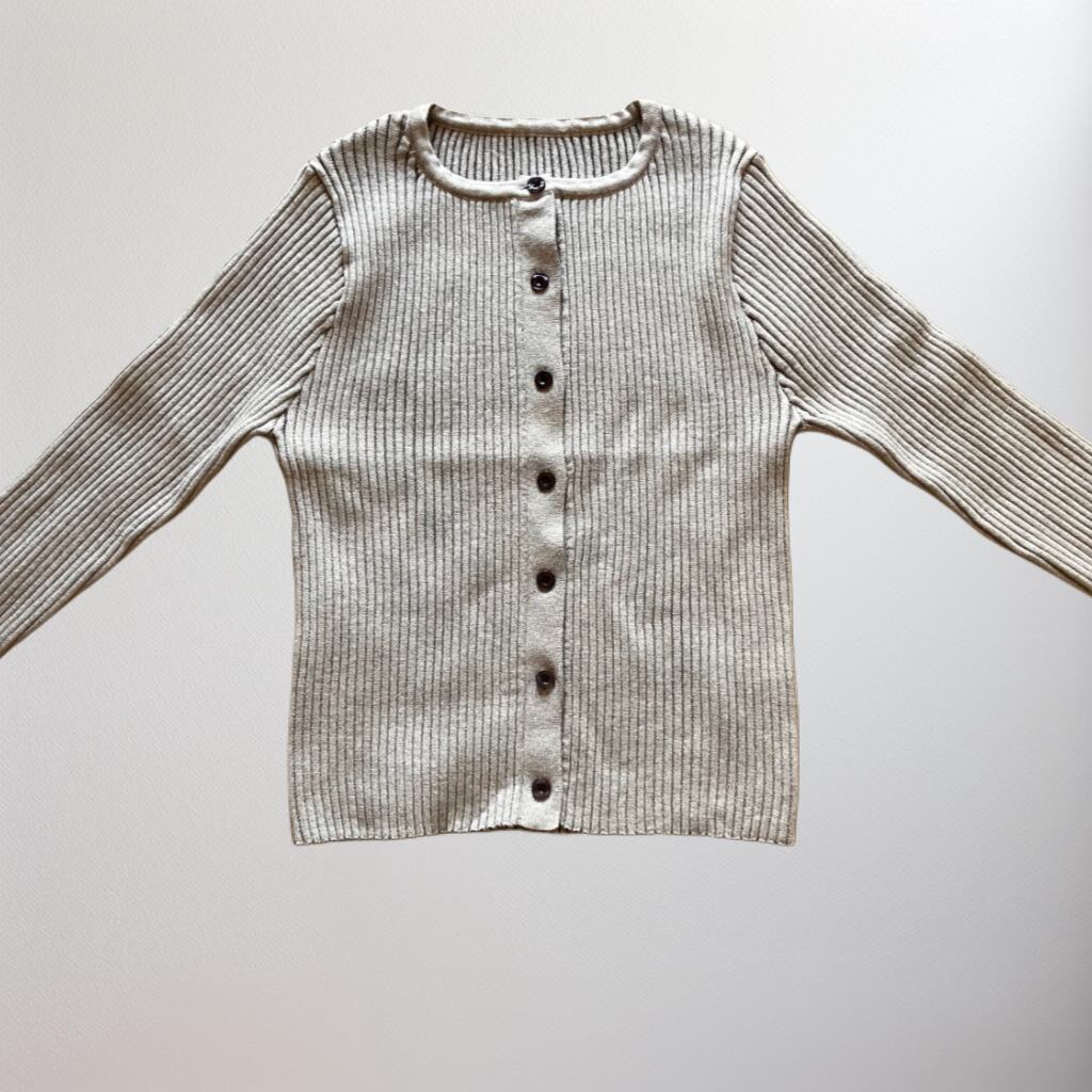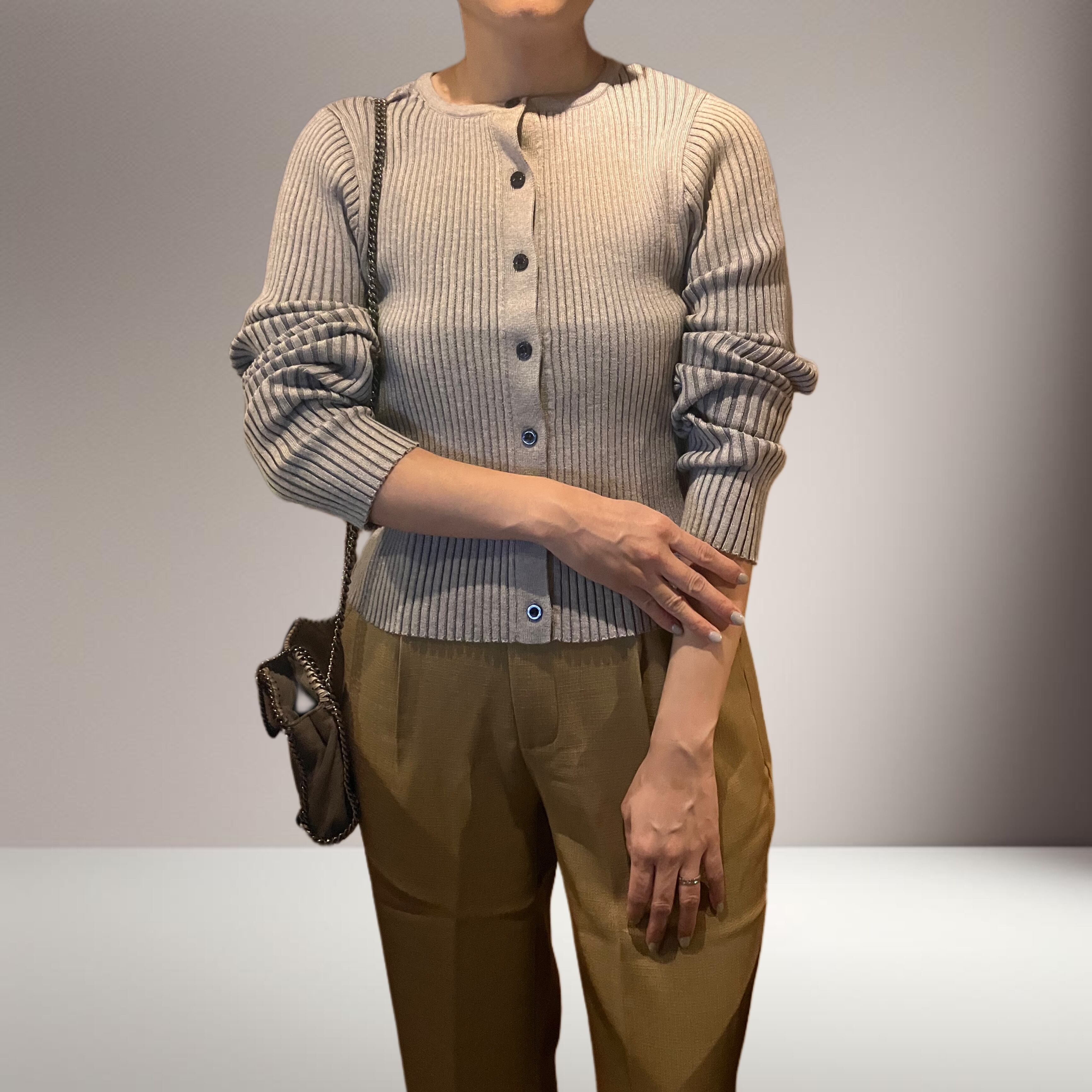 シンプルなクルーネックとさりげない、サムホールデザインがポイントのニットカーディガン。