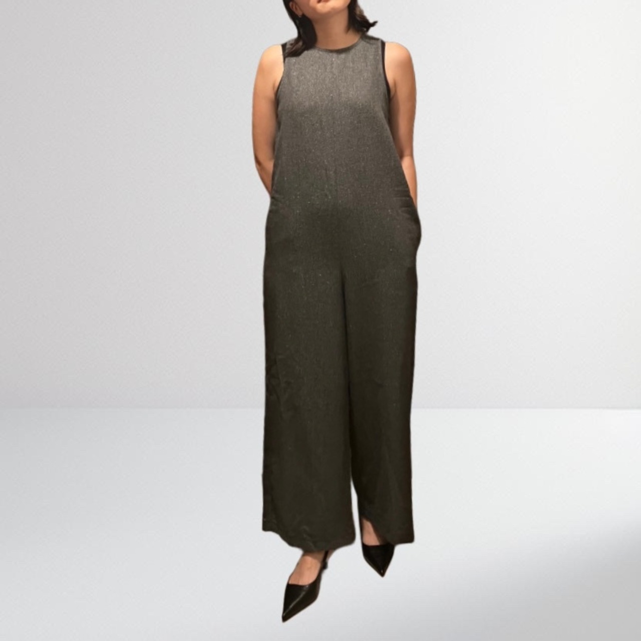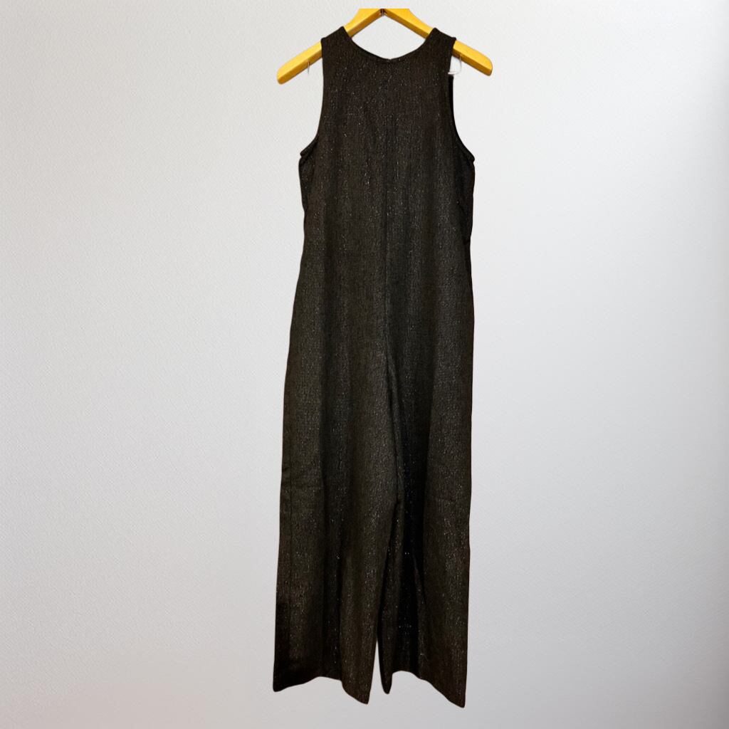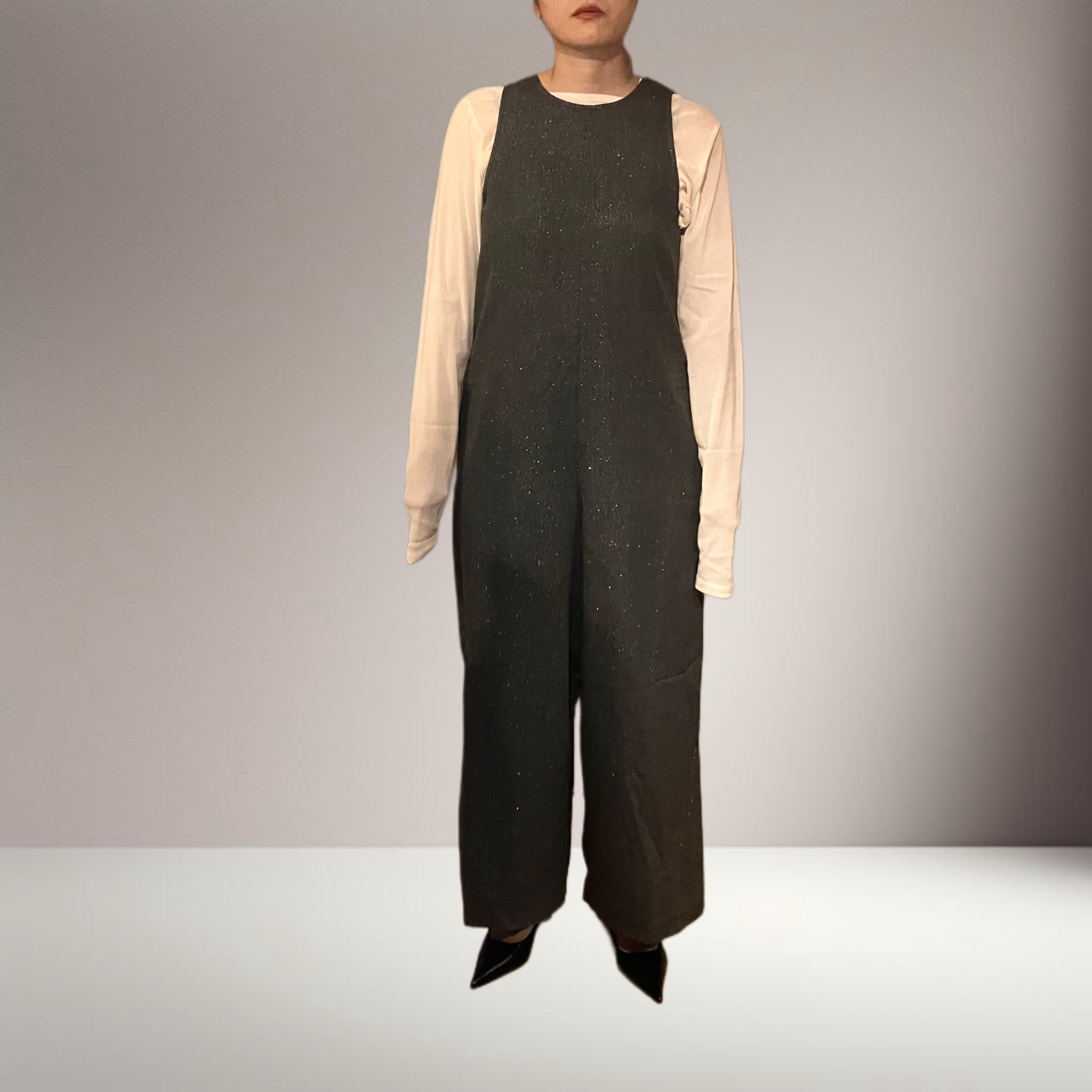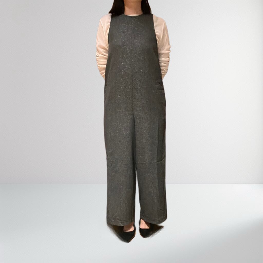 滑らかなヘリンボーン生地にラメをプラスした、上品ながら程よい華やかさを持つオールインワン。