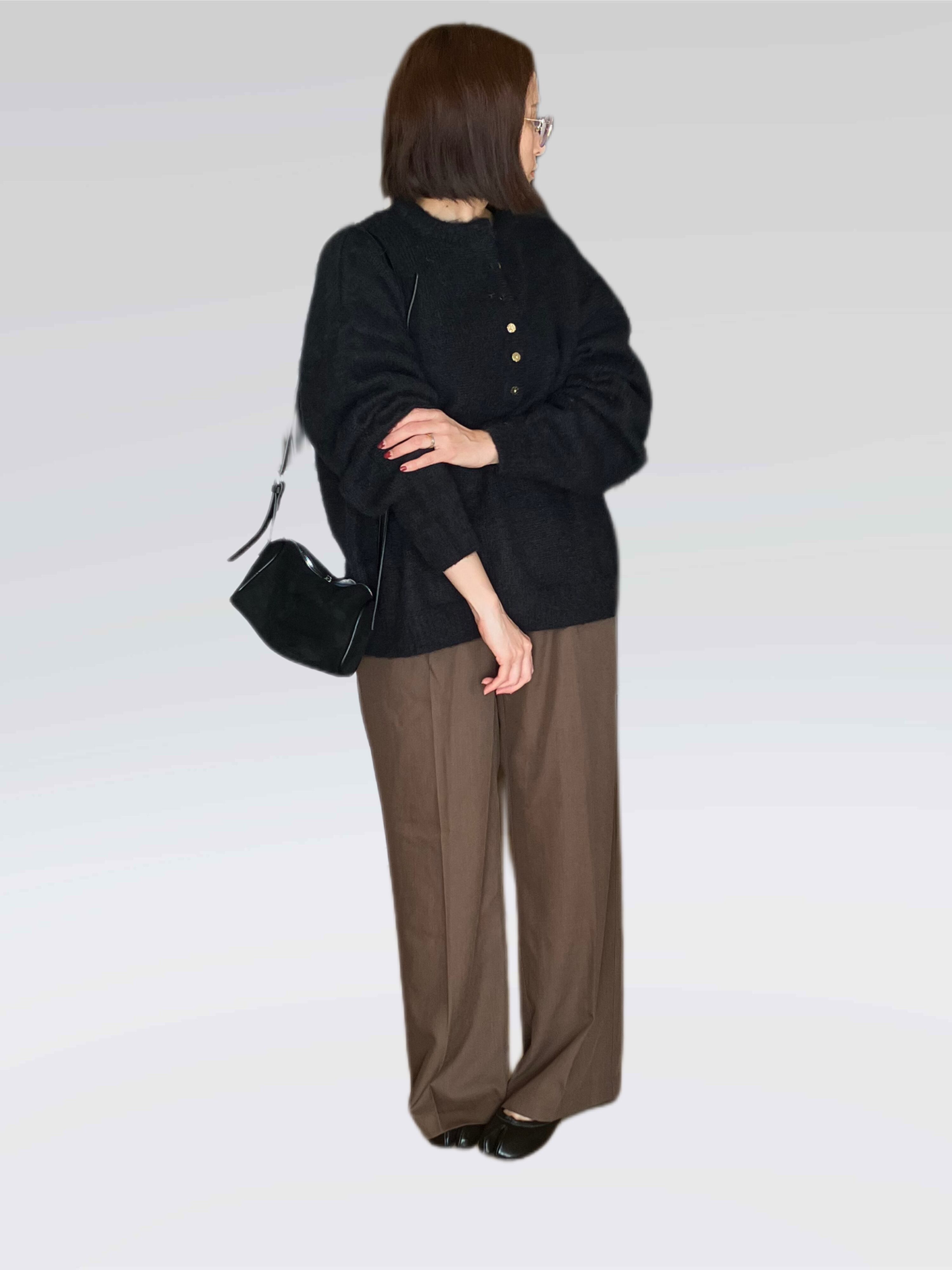 【Material】ウールのような暖かみのあるタッチの素材を使用。チクチク感が少なく、ソフトで心地よい肌触りです。見た目も暖かく、秋冬のコーディネートに最適ながら、ご自宅でのお手入れがしやすいのも魅力です。